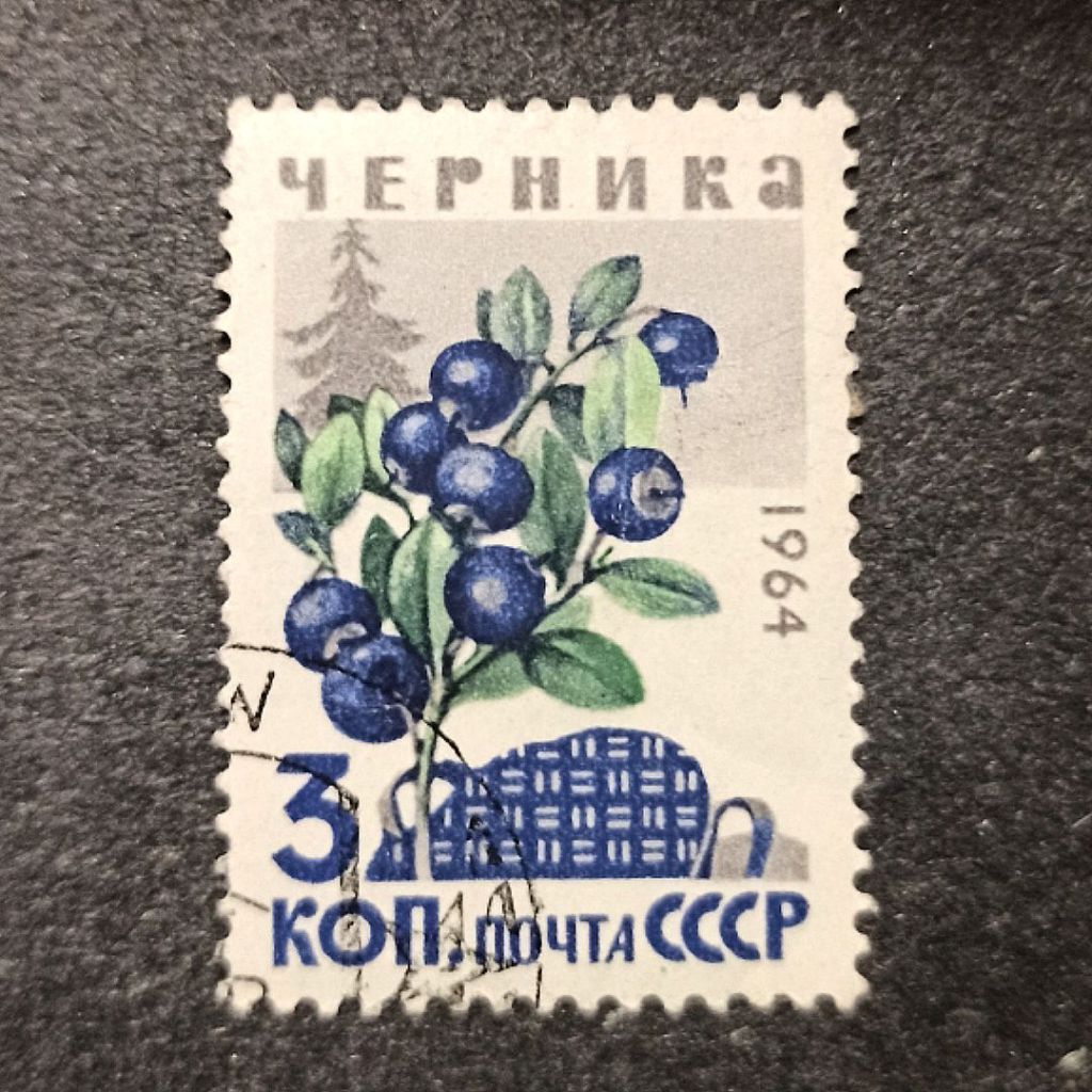 Pora na odrobinę wytchnienia i zmianę tematu, bowiem kolejny egzemplarz zatytułowany jest „czernika”, co w języku rosyjskim oznacza czarną jagodę. To typowy przykład przedstawiania natury na sowieckich znaczkach, a ta bardzo często licuje się z naszym wyobrażeniem przyrody, wszak wielka połać Rosji położona była i jest w klimacie umiarkowanym kontynentalnym, tak dobrze nam znanym.